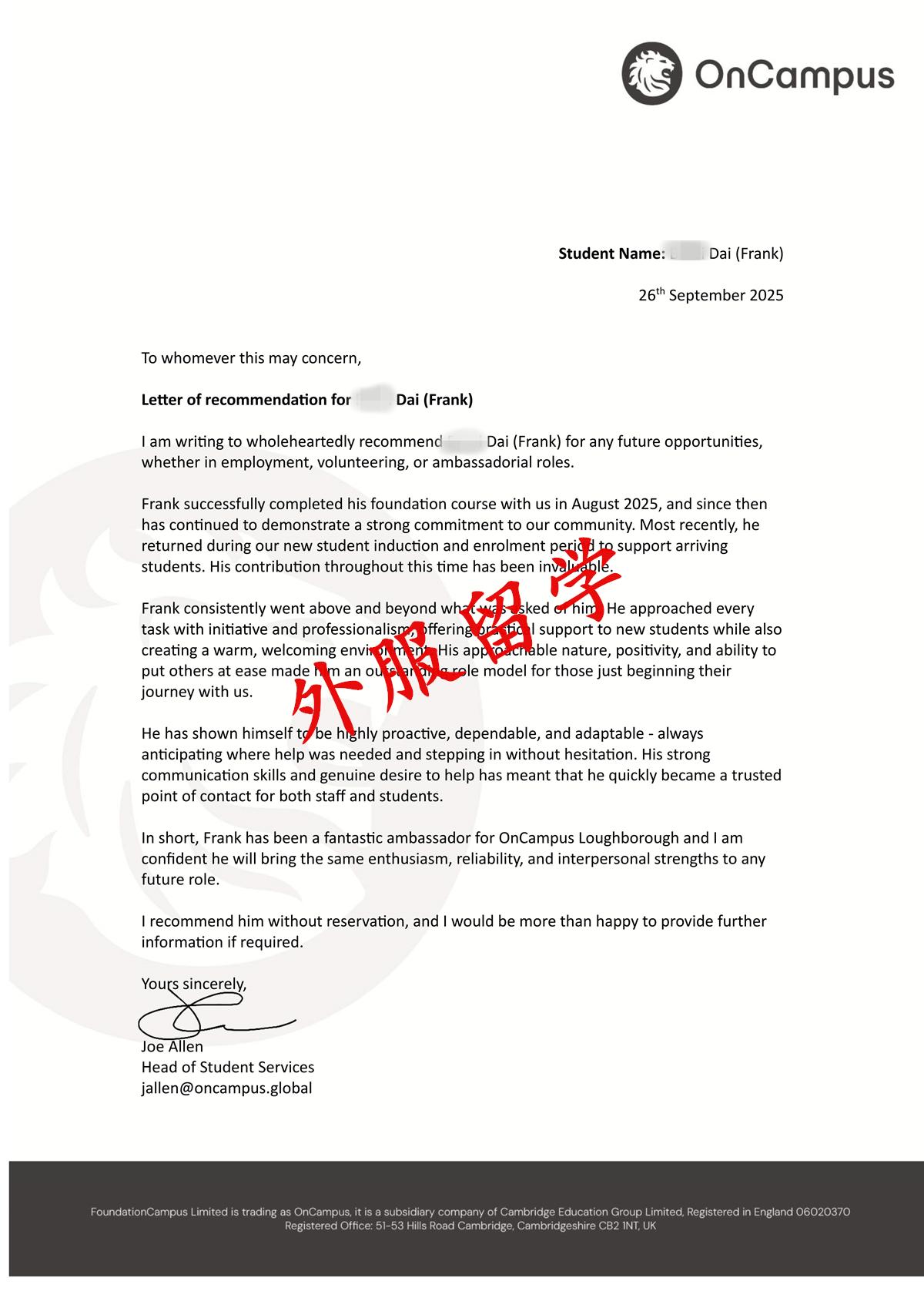 功夫不负有心人,2025年9月,代同学凭借优异的预科成绩、出色的学术表现以及积极的校园参与度,成功获评拉夫堡大学本科预科 “优秀明星学员”。在表彰仪式上,学校校长亲自为其颁发奖状与推荐信,并高度肯定了他在学习过程中展现出的毅力与潜力。这份荣誉不仅是对代同学个人努力的最高认可,更是对“外服留学”专业规划能力的有力证明。
