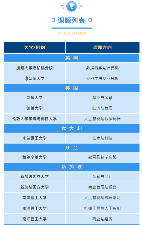 今年暑假,我们携手美国加州大学洛杉矶分校、康奈尔大学,英国剑桥大学、伦敦大学学院,意大利米兰理工大学、芬兰赫尔辛基大学,新加坡国立大学、南洋理工大学,以及香港大学、香港科技大学、香港中文大学、香港浸会大学等全球知名高校,为你带来30+热门课题,覆盖商科、理工、人文、艺术、社科等多个专业方向