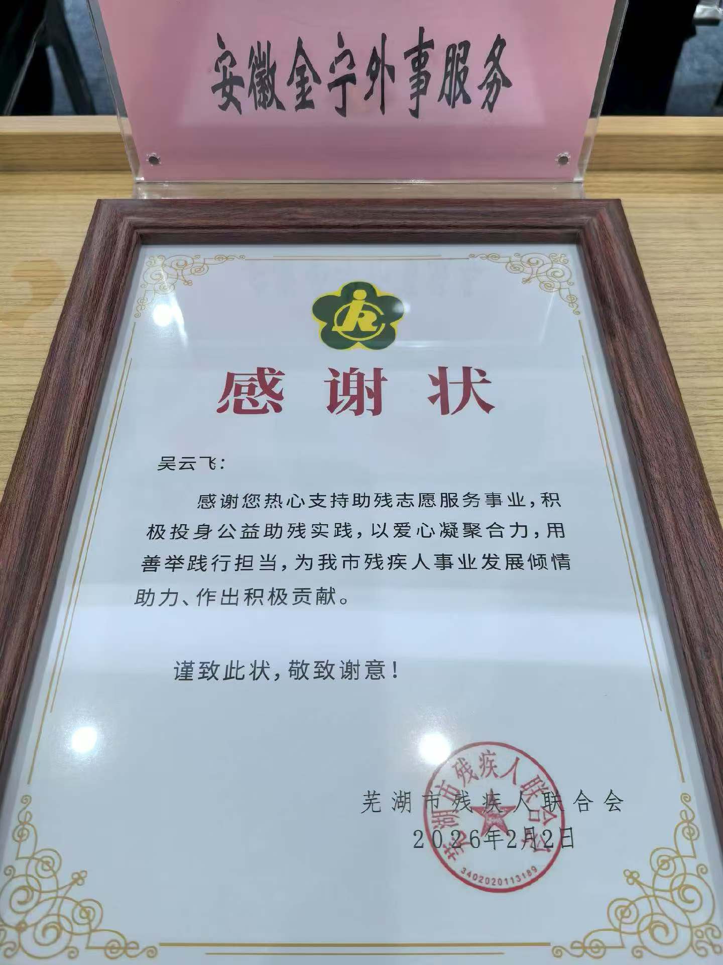 2026年2月2日,芜湖市残疾人联合会(以下简称“市残联”)表彰大会顺利召开,会议全面总结了全市残疾人事业发展的丰硕成果,表彰了一批在助残扶残工作中表现突出、贡献卓著的先进单位与个人。其中,外服留学凭借在残疾人公益助学、融合教育支持等方面的扎实举措与显著成效,光荣上榜,获市残联官方表彰,彰显了企业践行社会责任、传递大爱的责任与担当。