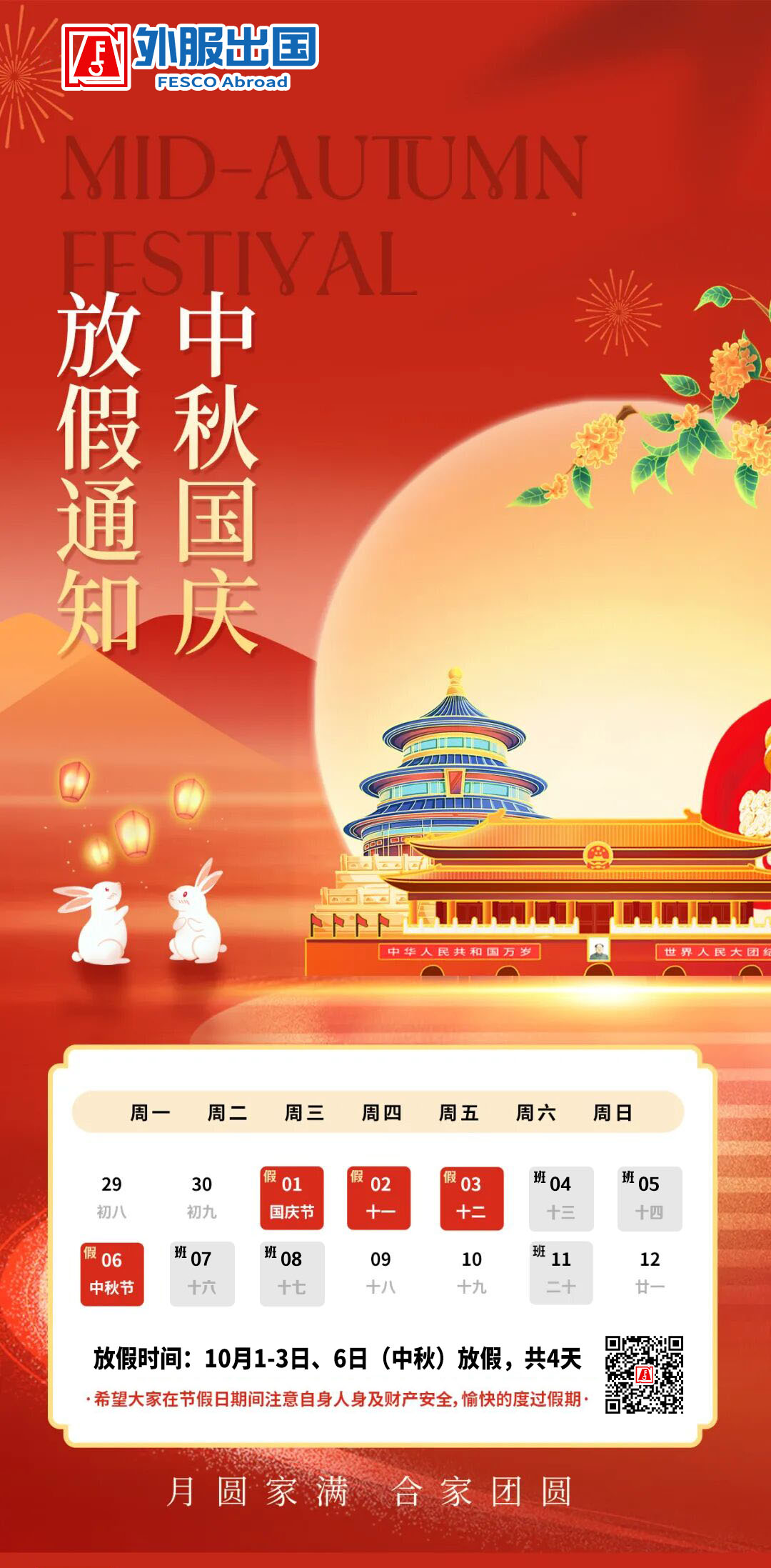 金秋时节,丹桂飘香,我们即将迎来祖国76华诞。2025年国庆恰逢中秋,双节同辉,更添喜庆。根据国家法定节假日放假安排,并结合“外服出国”实际情况,2025年国庆中秋放假值班安排如下: