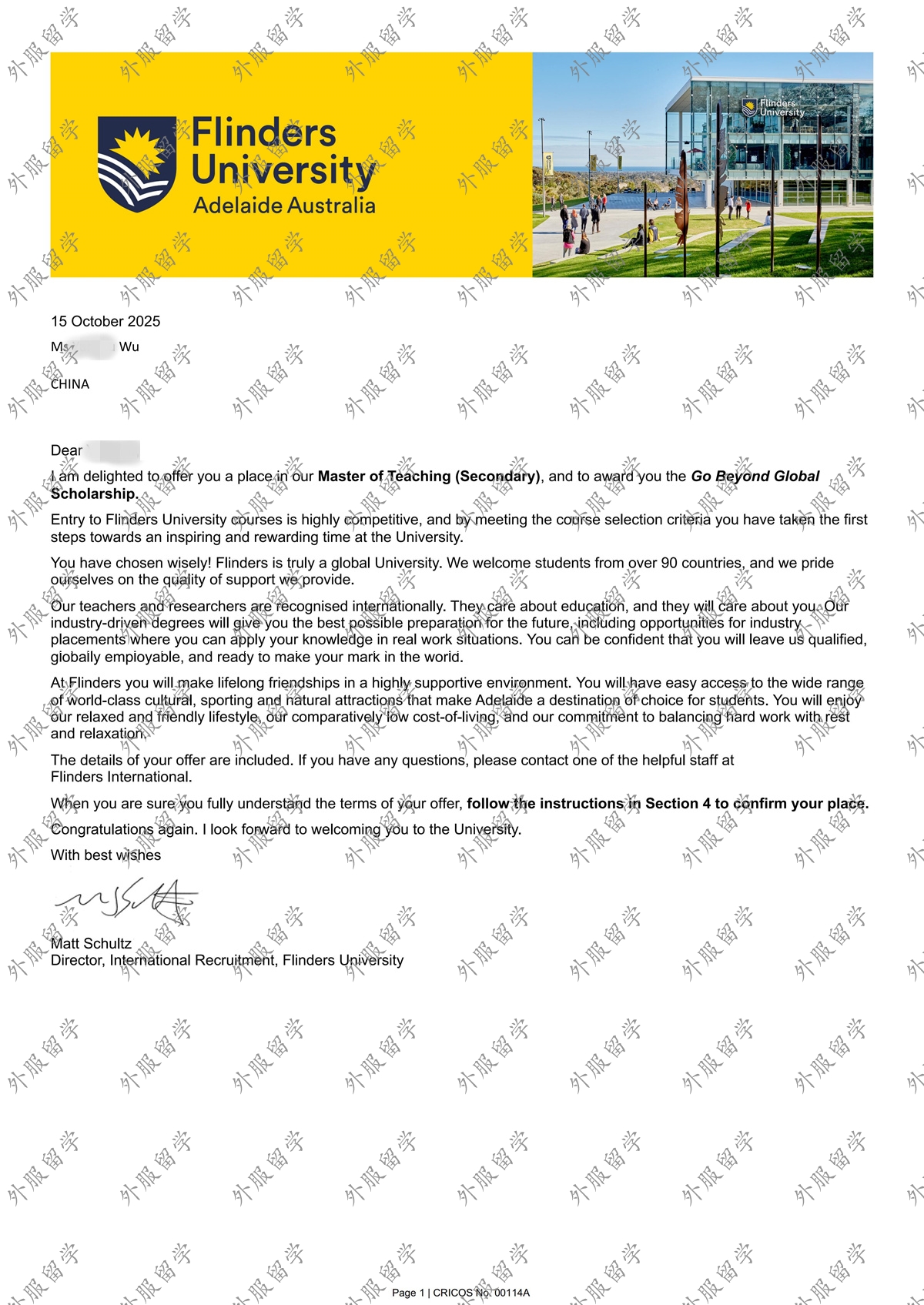 澳大利亚弗林德斯大学中学教学专业硕士offer