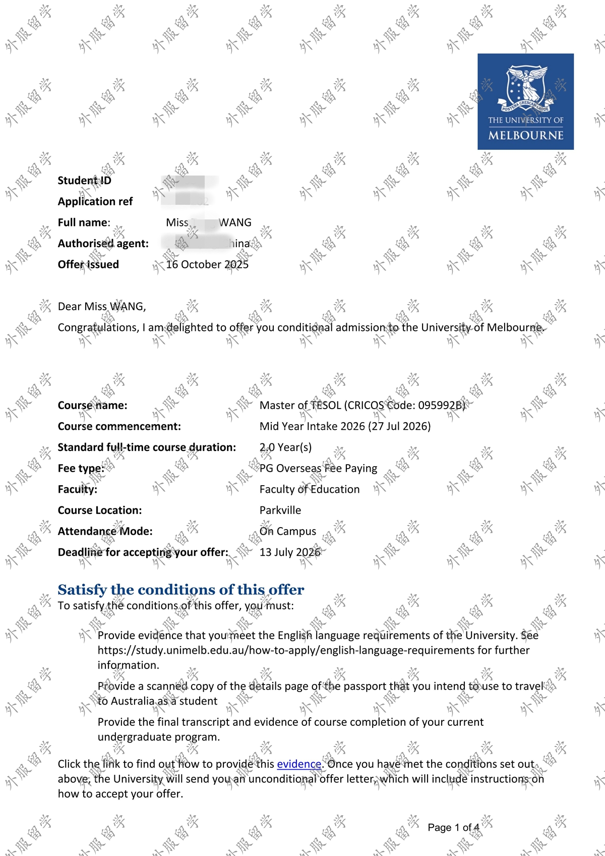 澳大利亚墨尔本大学TESOL专业硕士offer