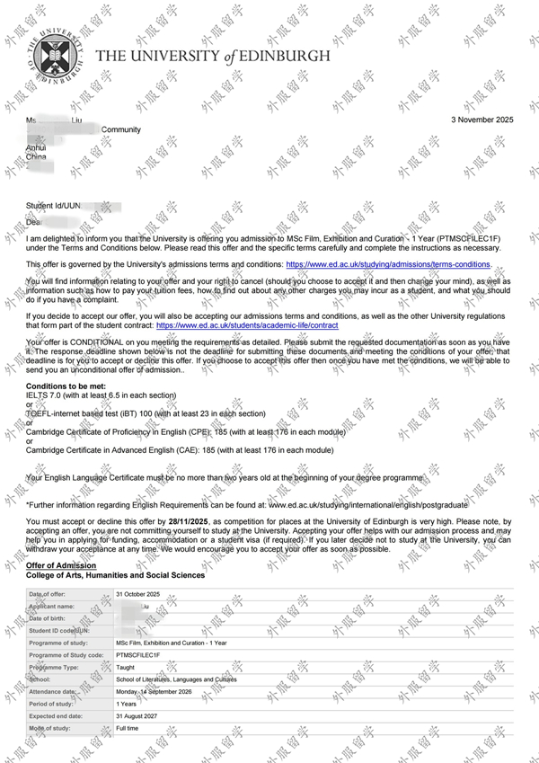 英国爱丁堡大学电影、展览与策展专业硕士offer