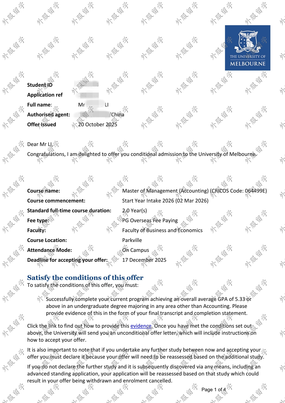 澳大利亚墨尔本大学管理学(会计方向)专业硕士offer